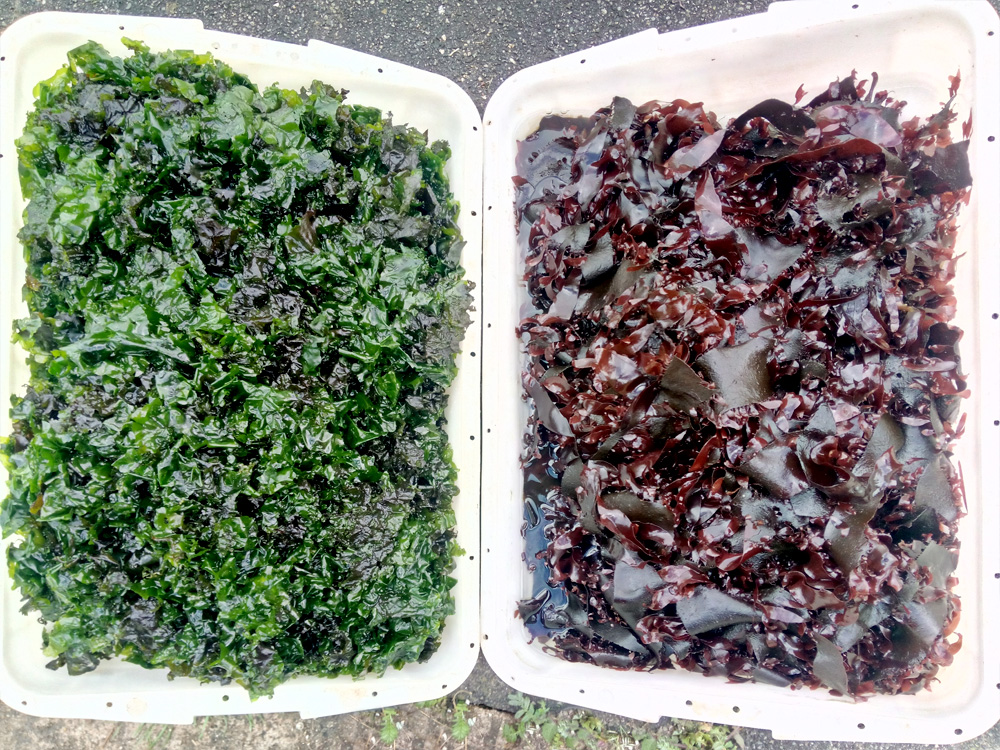 Eine reiche erste Ernte aus der landgestützten Makroalgenkultivierung: Rotalgen und Grünalgen wurden im Mai 2020 fern der Küste erfolgreich produziert.